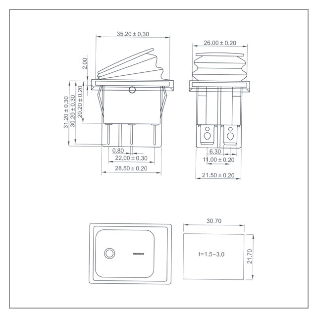 技术参数: ◆安装尺寸:30.7mm×21.7mm;T85 ◆ 规格:20A 125VAC ; 16A 250VAC; ◆ 接触电阻:≤35mΩ; ◆ 绝缘电阻:≥100mΩ; ◆ 耐电压:1500VAC,1分钟; ◆ 操作温度:-25℃~+85℃; ◆ 电气寿命:>10000 次。